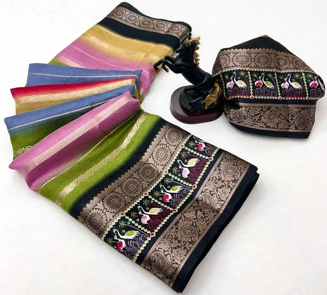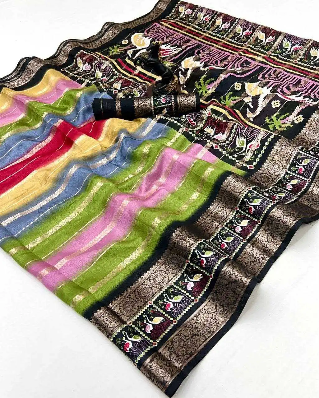 SareeSpice Silk Fabric With Duel Jacqrad Weaving Border Zari Border Digital Printed Kalamkari Pallu Striped Zari Body Exclusive Colourfull Design