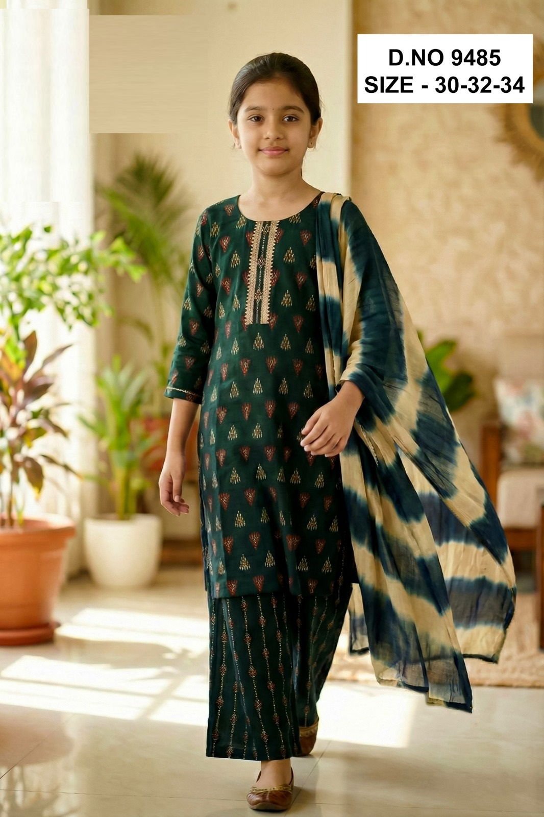 Rubesha Plazo Set 9485 Rayon Printed Kids Kurti And Bottom Dupatta Collection Wholesale