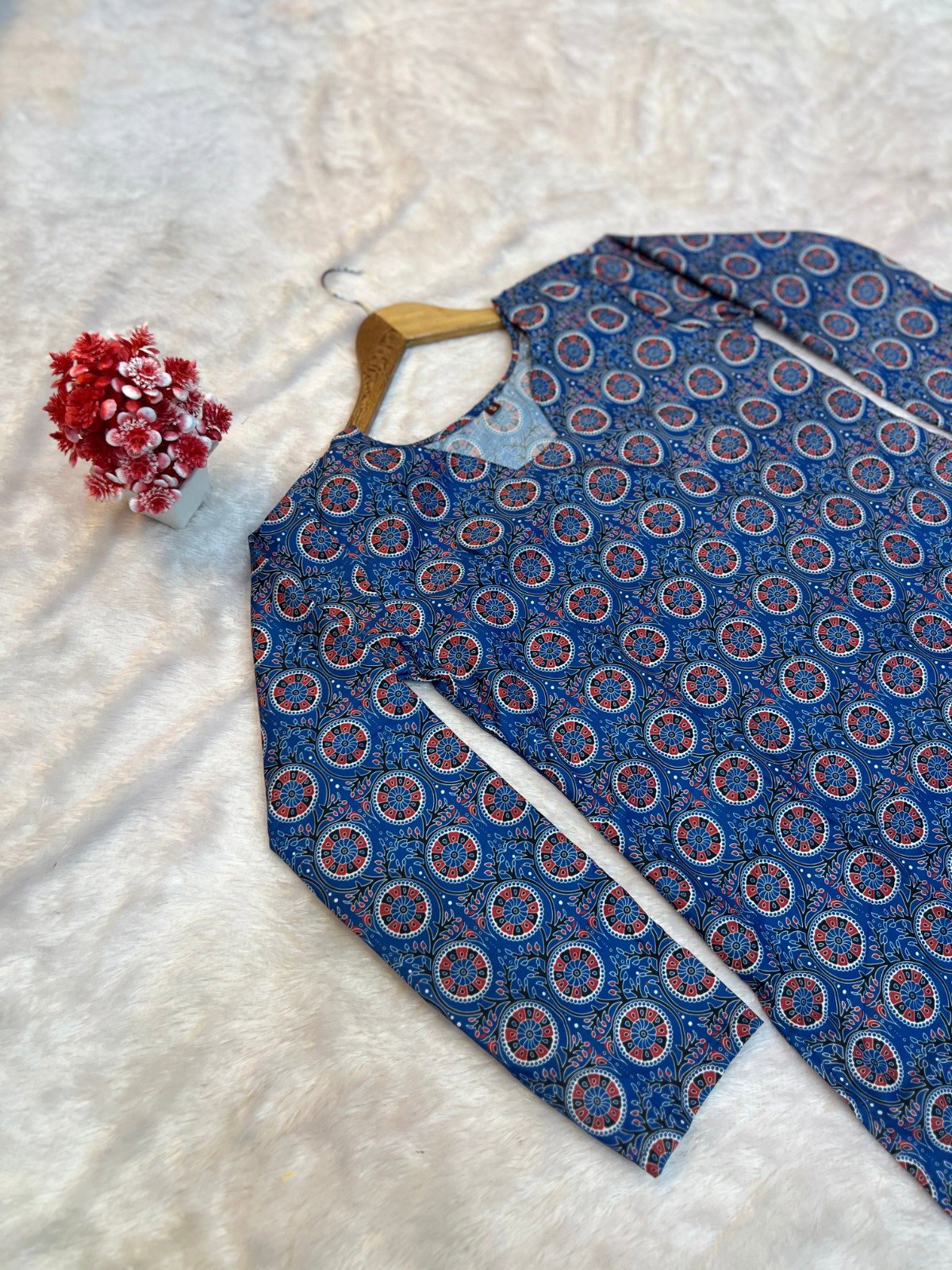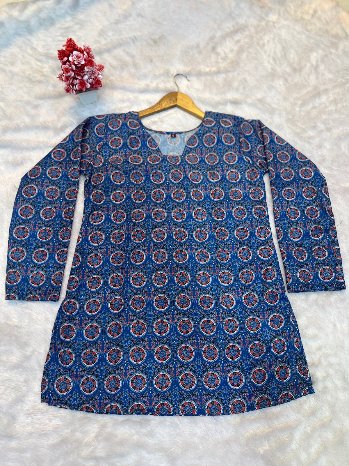 | Details | Fabric:- Heavy Maslin with Digital Prints Work and Fancy Sleeves Pattern | Length: 30” | Size Set : S to XXL |