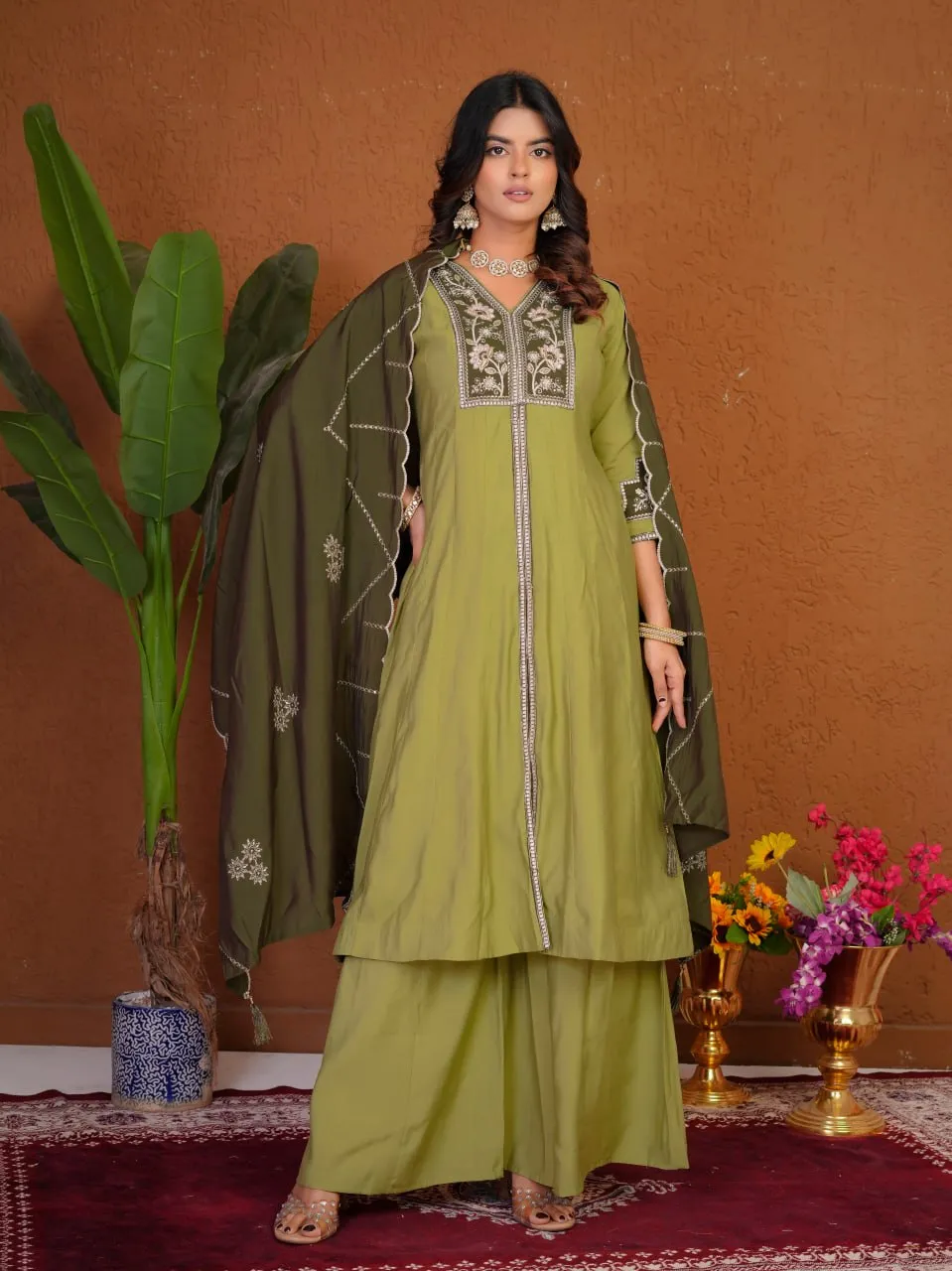 | Detail | Top – Roman Silk ,Work -Multi Embroidery Thread With Beautiful Hand Work ,Chest Size-M(38”),L(40”),XL(42”),2XL(44”),3Xl(46”,Length- 46”Sleeve, Length -16”, Kurti Flair- 3 MTR , Bottom –Roman Silk ,Flair-1 mte , Length- 38” Dupatta – Roman Silk ,Work- Heavy Embroidery Work With Border Less Work ,Length -2.20 Meter, Package Contains -Kurti, plazo, Dupatta , Weight- 0.70 kg |