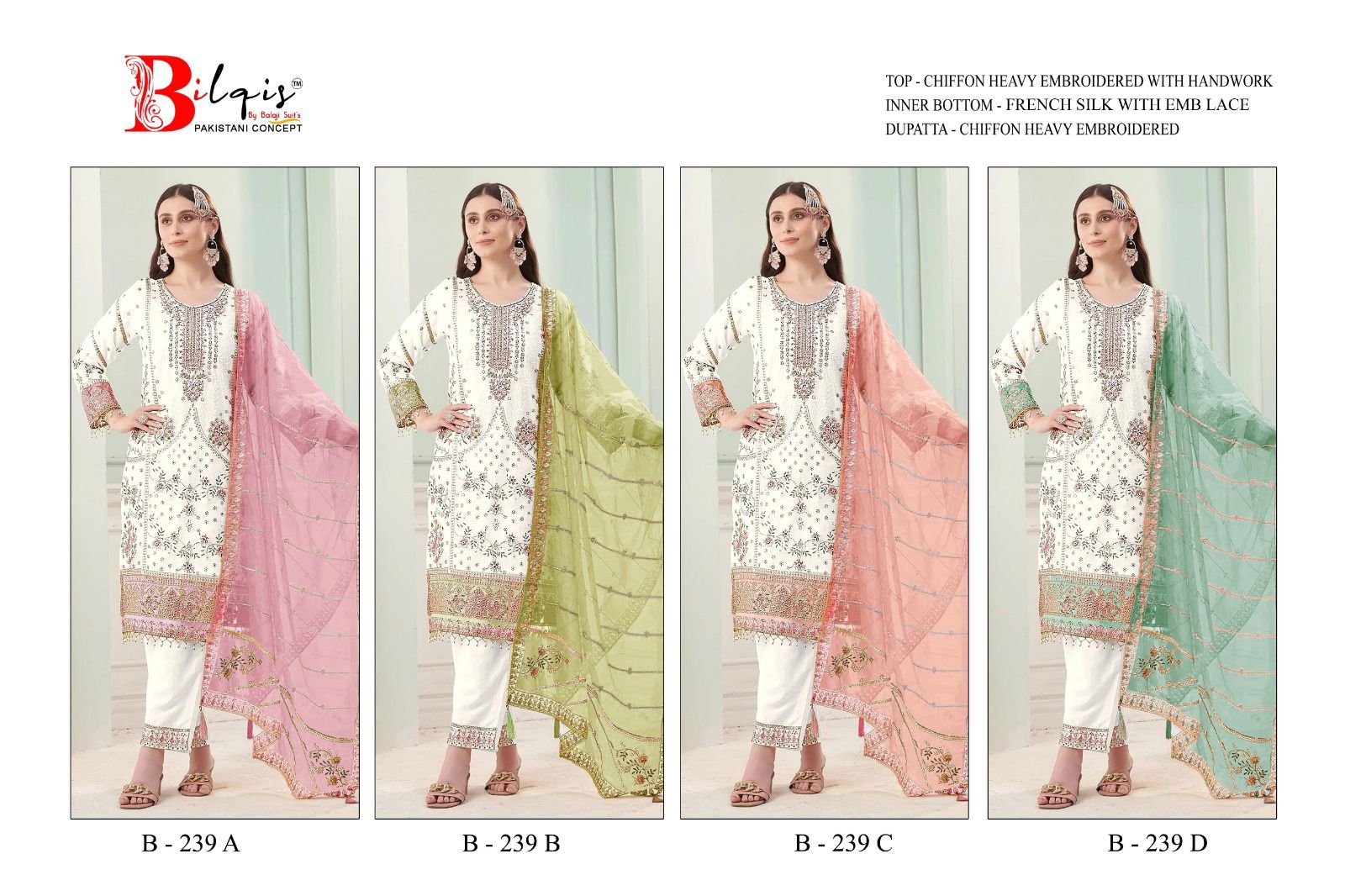 Bilqis B 239 A To D Chiffon With Embroidery Pakistani Salwar Kameez Wholesale