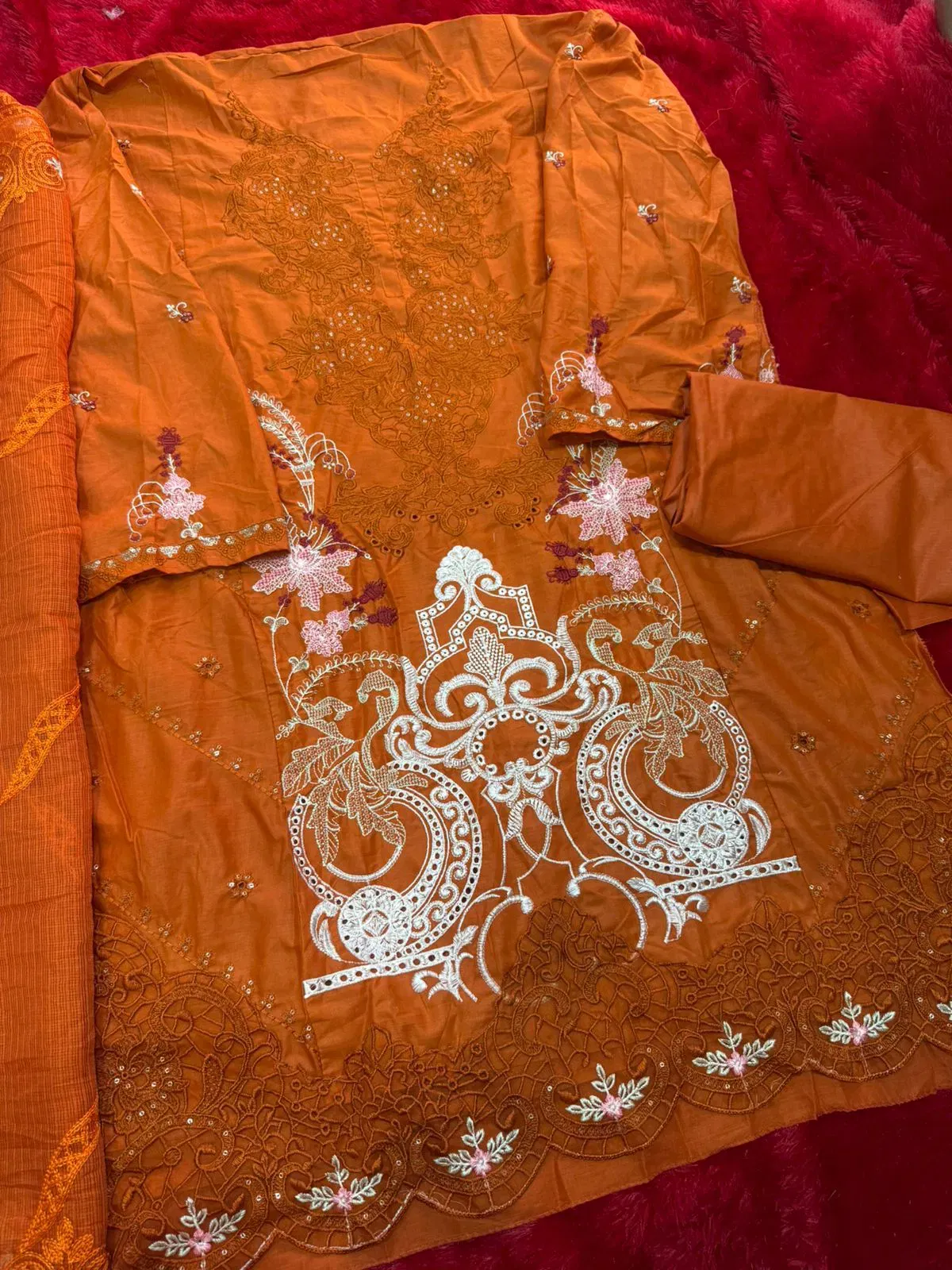 | Details | Top :- Pure Cotton With Self Embroidery Attached Embroidered Patches | Bottom :- Cotton Solid | Dupatta :- Kota Heavy Embroidery | [Pakistani Copy] |
