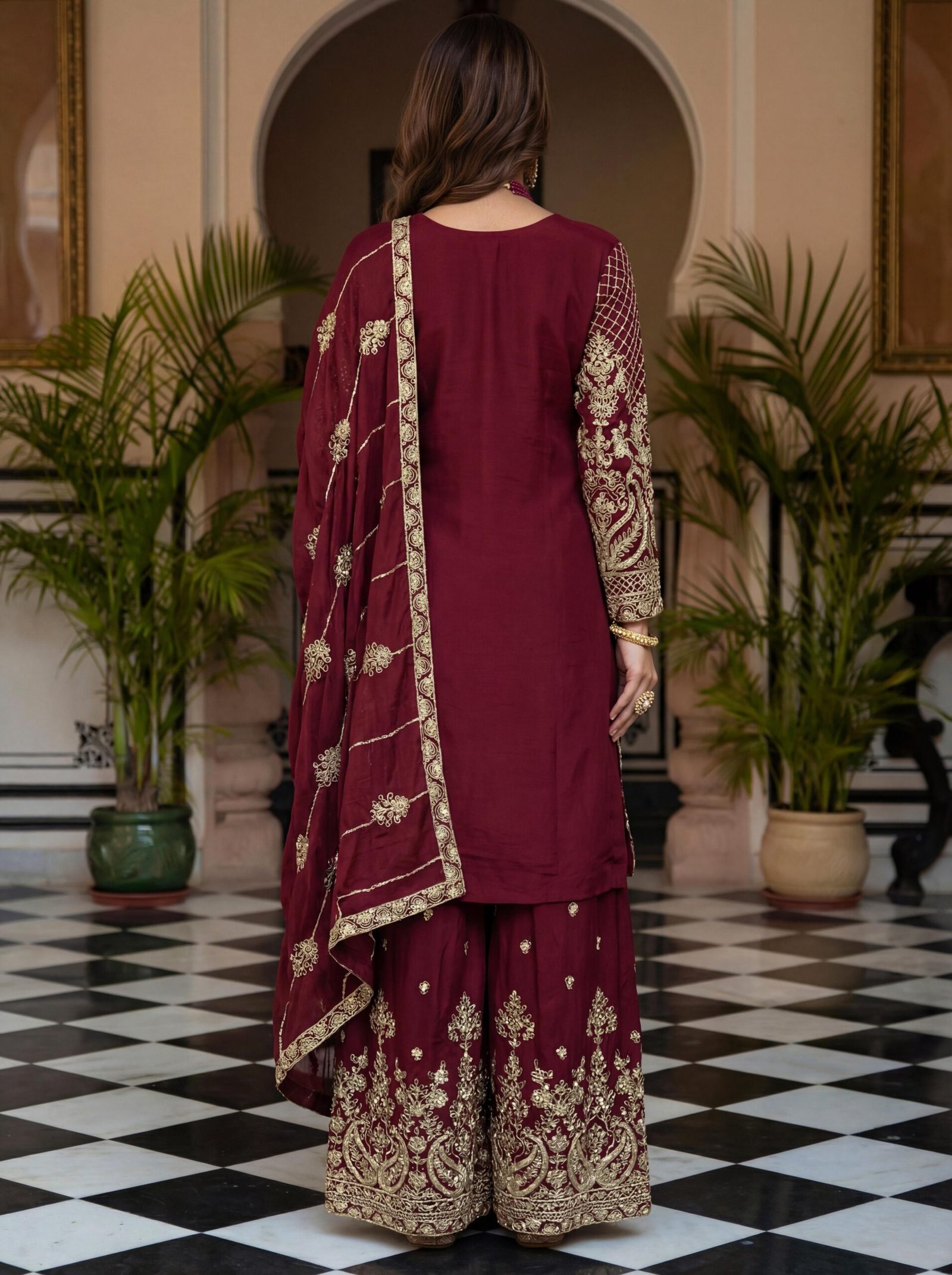 | Details | Kurti (Stitched) Kurti Fabric : Chinon Silk Kurti Innner : Crap Kurti Work : Embroidery Codding Sequence Zari Kurti Length : 41” Kurti Sleeve: 16” Duppta Fabric : Chinon Silk Duppta Work: Embroidery Codding Sequence Design Work Bottom (Full stitch) Bottom Fabric : Chinon Silk Bottom Work: Embroidery Codding Sequence Design Work |
