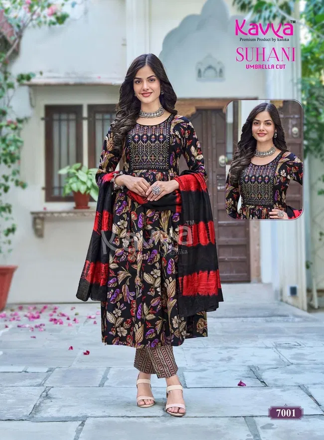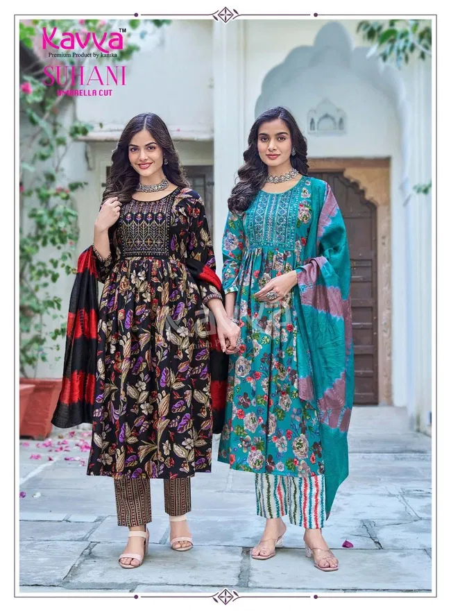 Kavya Suhani vol 7 Umbrella Cut Poly Viscose Foil Print Kurti With Bottom and Dupatta Collection Wholesale