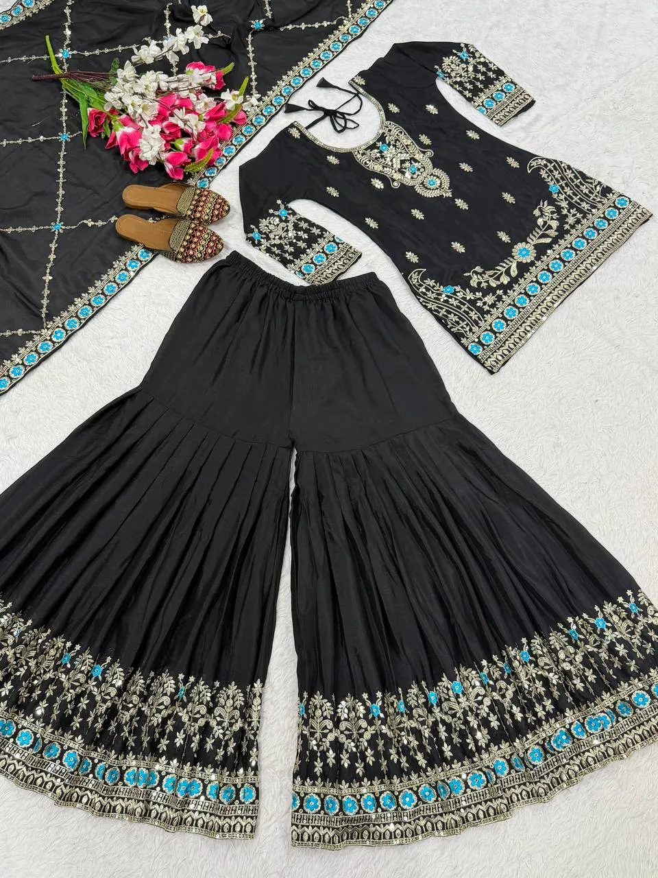 | Details | Top – Heavy NC Vichitra Silk Material With 5mm Sequence And Embroidery Work, (Fully Sleeves ), Inner – Micro Cotton, Length – 30-31 Inches, | Bottom – Heavy NC Vichitra Silk Material 5mm Sequence And Embroidery Work, (Fully Stiched Sharara Palazzo Styles and Length is 40-41), Inner – Micro Cotton | Dupatta – Heavy NC Vichitra Silk Material With 5mm Sequence And Embroidery Work, Dupatta Length – 2.30mtr | Size – S(36),M(38), L(40),XL(42),2XL(44), 3XL(46) |
