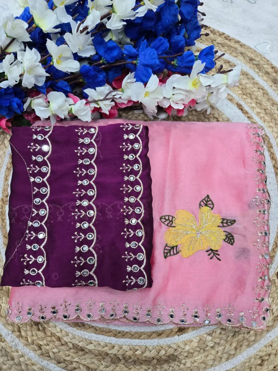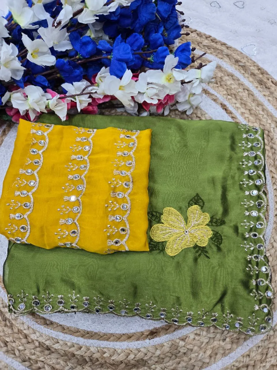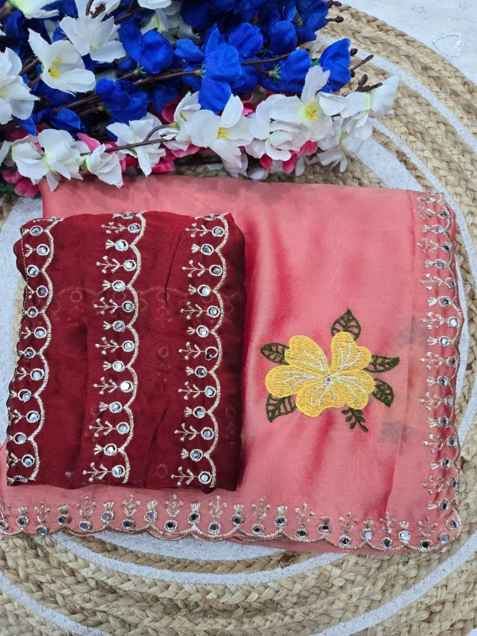 | Details | Saree – Rangoli sillk, LENGTH – 5.50 Mtr, WORK – Original jari riyal mirror work | blouse -Rangoli silk with jari mirar work blouse cut:- 0.80 |