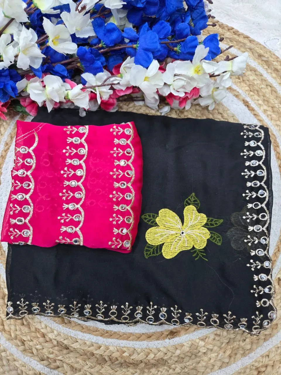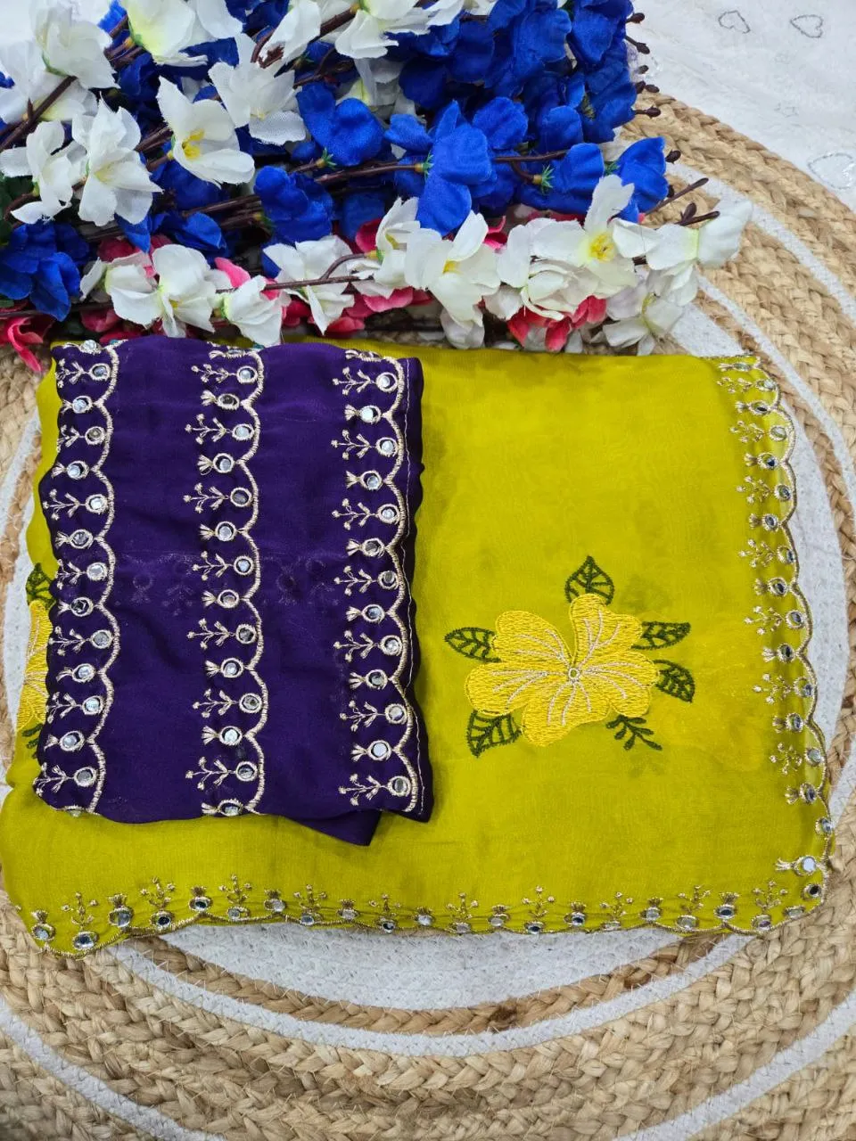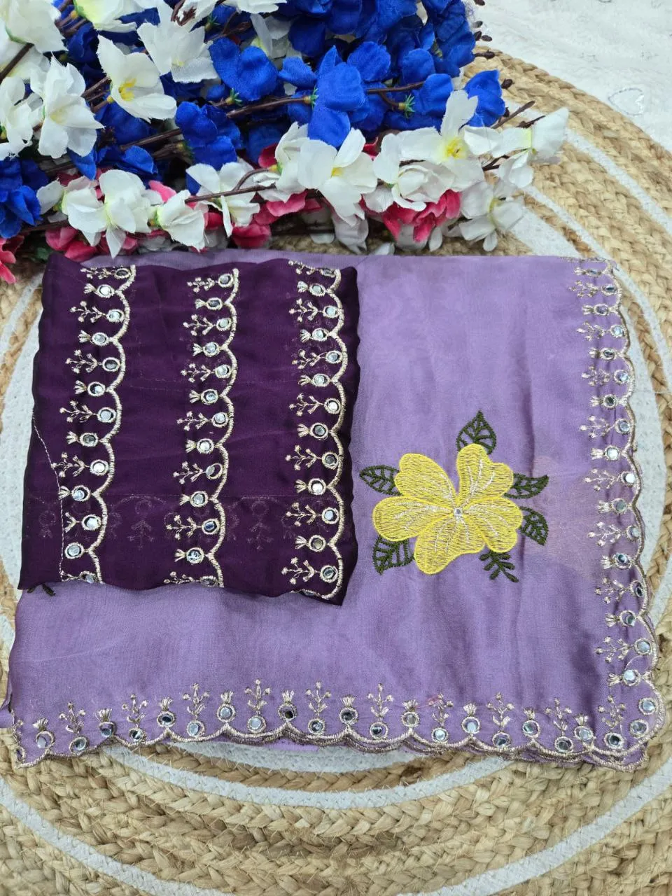 | Details | Saree – Rangoli sillk, LENGTH – 5.50 Mtr, WORK – Original jari riyal mirror work | blouse -Rangoli silk with jari mirar work blouse cut:- 0.80 |